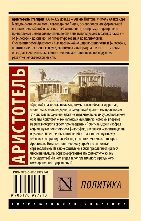 «Средний класс», «экономика», «семья как ячейка государства», «политика», «конституция», «гражданский долг» – мы произносим эти слова и выражения, даже не зная, что самим их существованием обязаны Аристотелю, гениальному мыслителю, который впервые ввел их в оборот в своем произведении «Политика», где и изобрел социальную и политическую философию, впервые в истории выделив изучение общественных отношений в самостоятельную науку.