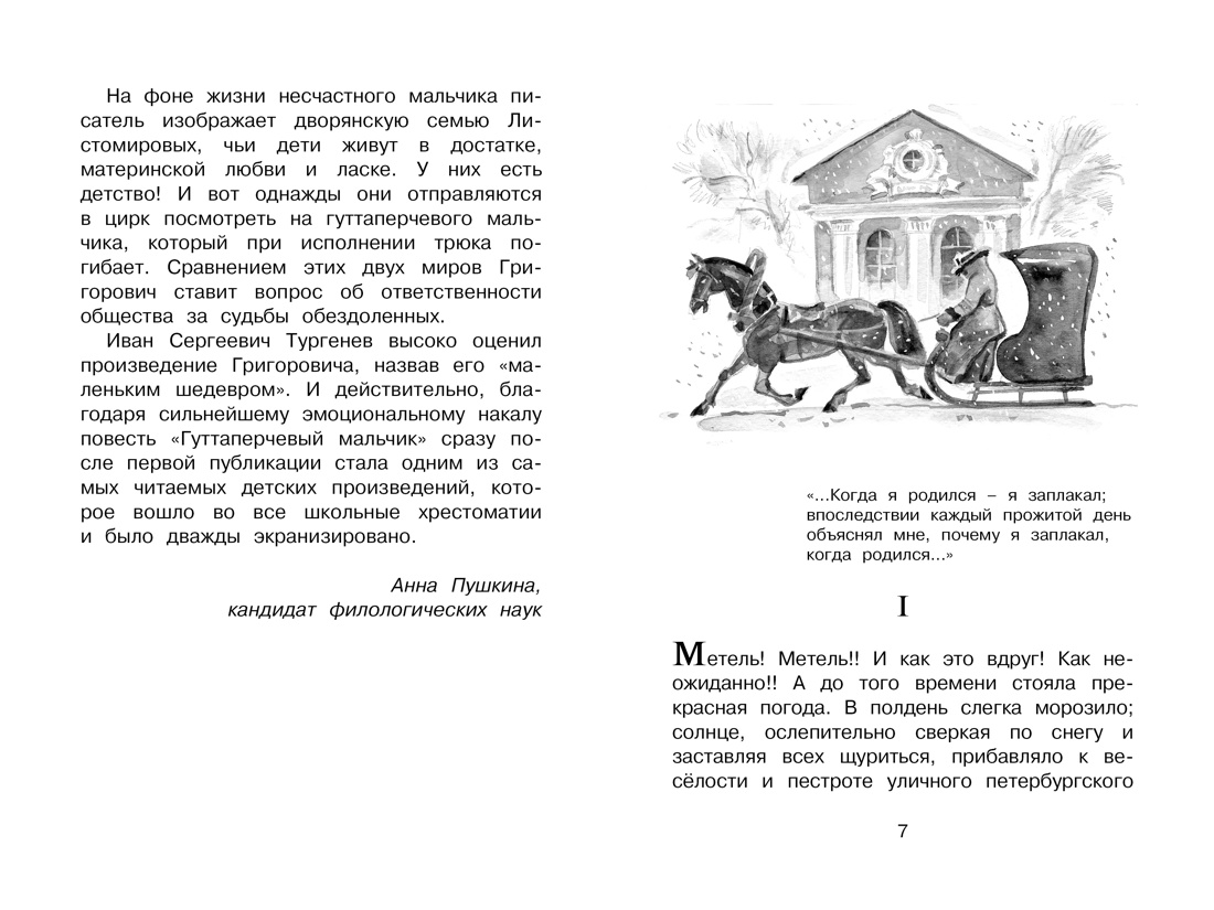 Эта история короткой трагической жизни мальчика-сироты, волей судьбы попавшего в руки циркового акробата – человека грубого и жестокого, пробуждает в читателях чувство милосердия и сострадания. Невероятно сильная по своему эмоциональному накалу, повесть «Гуттаперчевый мальчик» сразу после первой публикации стала одной из самых читаемых детских книг и вошла во все школьные хрестоматии.