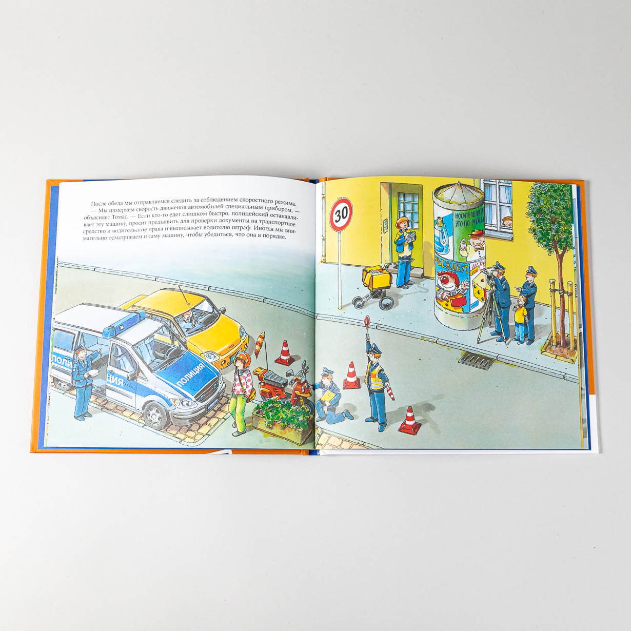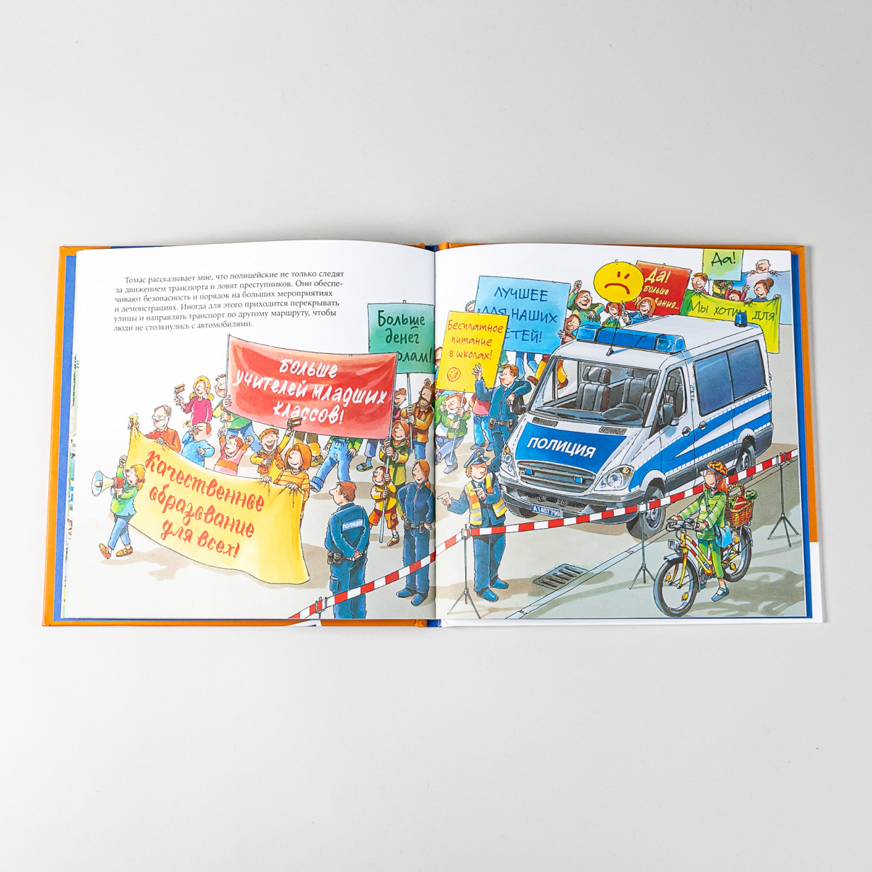 Все книги построены по принципу «один день из жизни…»: герои историй, дети, приходят в гости на работу к своим взрослым знакомым. В этой книге мальчик проводит целый день с Томасом — сотрудником полиции. Вместе с напарником Томас показывает, как устроена работа полицейского участка и чем занимаются разные подразделения. Читатели узнают о том, кто отвечает за порядок в парках, а кто на улицах, как ловят преступников, и как дежурные экипажи получают задания в течение дня.