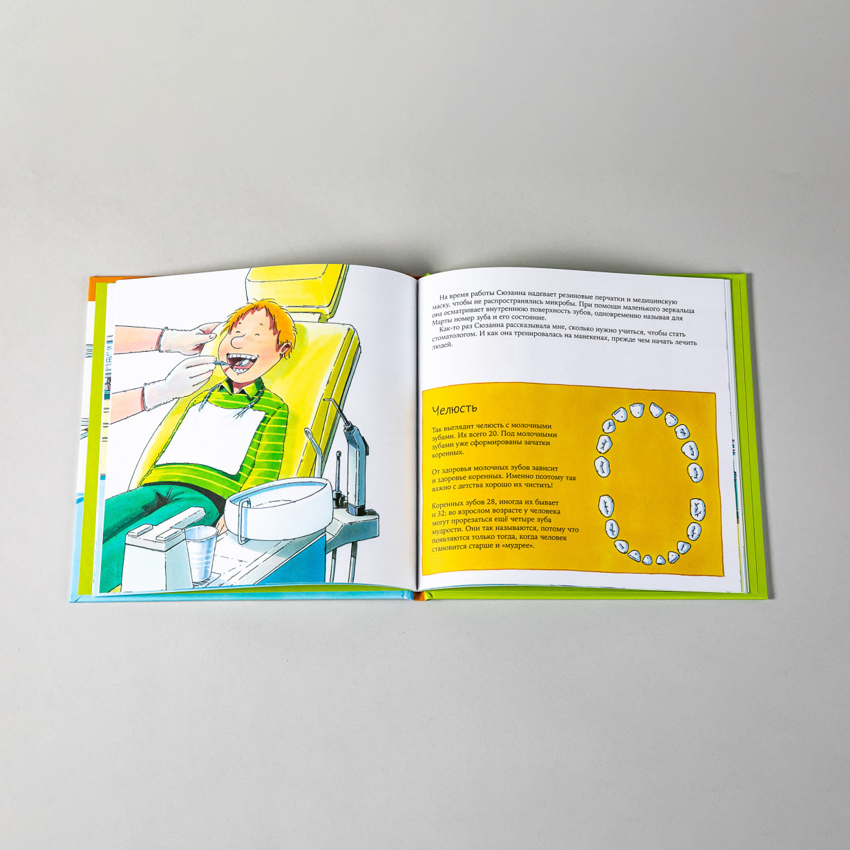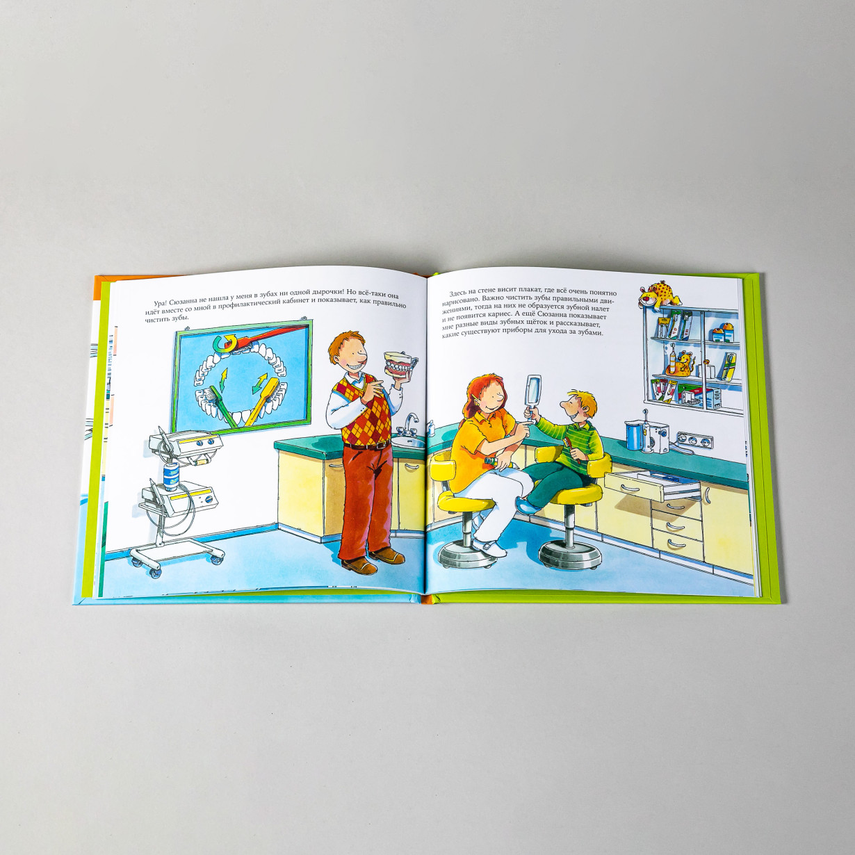 Все книги построены по принципу «один день из жизни…»: герои историй, дети, приходят в гости на работу к своим взрослым знакомым. В этой мальчик приходит на плановый осмотр к стоматологу и узнаёт много интересного о работе зубного врача: какие кабинеты есть в поликлинике, какие исследования в них проводят, как называются инструменты, которыми пользуется врач. И, конечно, как правильно ухаживать за зубами, чтобы они были здоровыми.