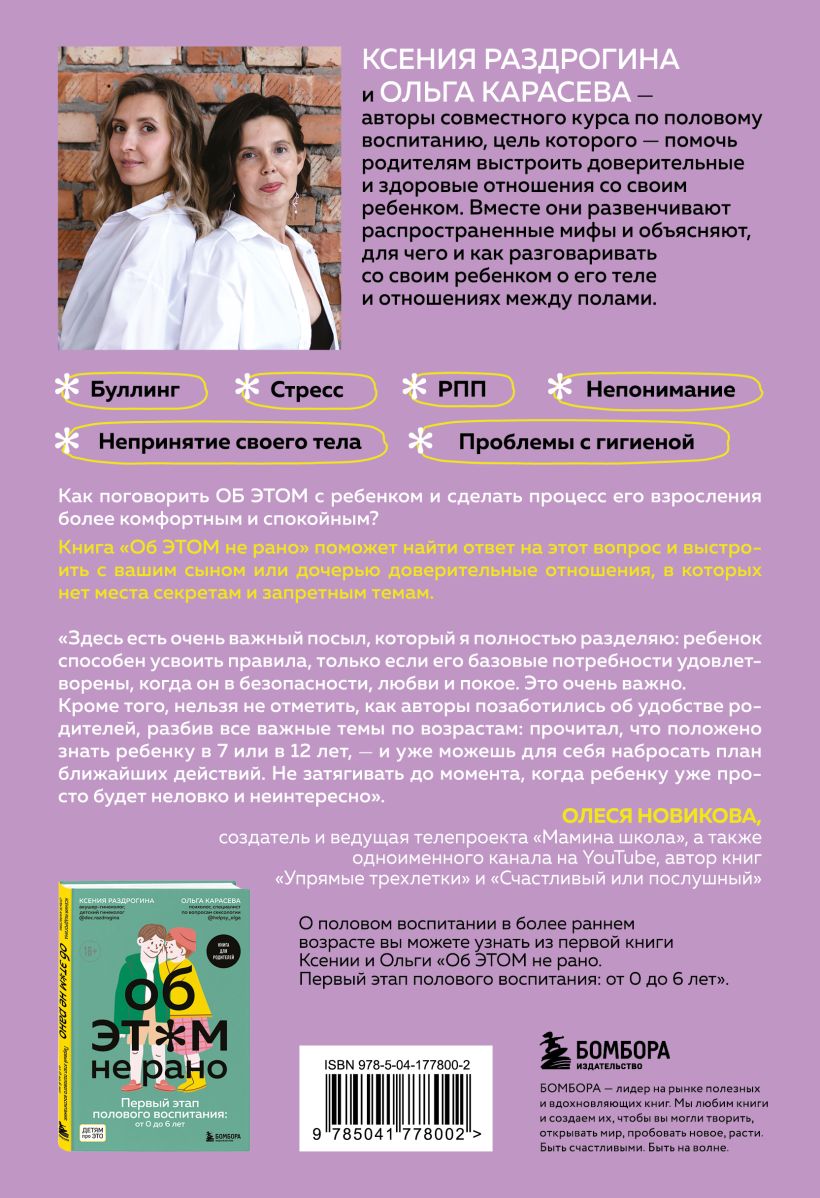 Ответы на эти и многие другие вопросы вы найдете в новой книге детского гинеколога Ксении Раздрогиной и психолога Ольги Карасевой «Об ЭТОМ не рано. Второй этап полового воспитания: от 6 до 14 лет». Авторы совместного курса о половом воспитании и книги «Об ЭТОМ не рано. Первый этап полового воспитания: от 0 до 6 лет», подскажут вам, как и зачем разговаривать с ребенком о его теле и взаимоотношениях между полами.
