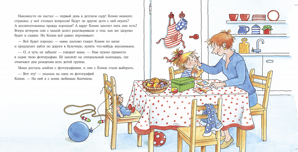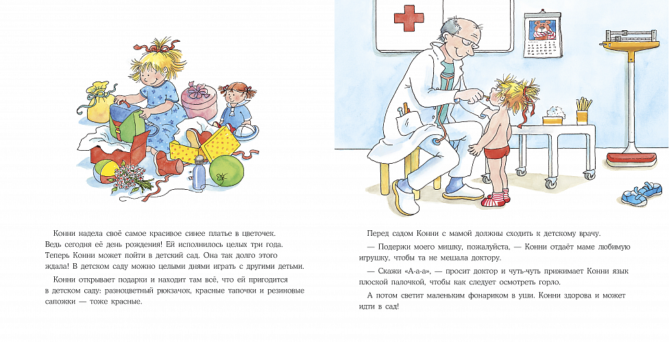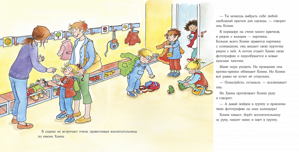 Все новое и неизвестное пугает ребенка, но с этой книгой ребенок точно не будет бояться первого дня в садике. Вместе с Конни малыш первый раз останется без мамы, проведет день в новом окружении и узнает, как разрешить деликатные ситуации — например, попроситься в туалет в незнакомом месте.