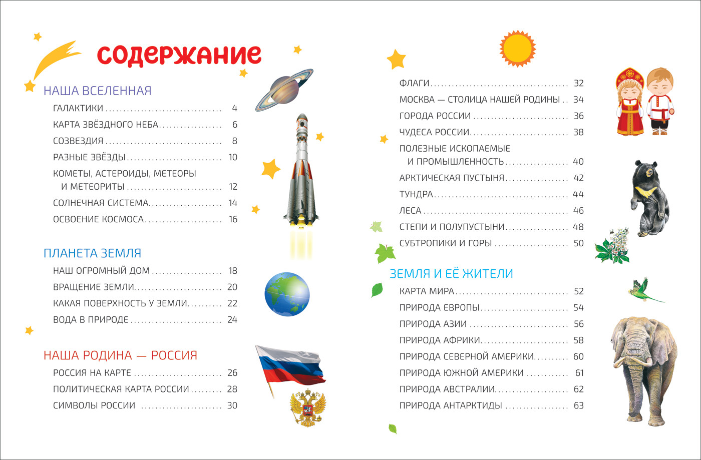 С этим атласом можно совершить невероятное путешествие по разным материкам, знакомясь с животными, обитающими на каждом из них. Но это не всё! Атлас поможет изучить звездное небо нашего полушария, узнать интересные факты о Вселенной и освоении космоса, запомнить, какая поверхность у земли, как происходит круговорот воды в природе, а также познакомит с природой России и населяющими ее народами.