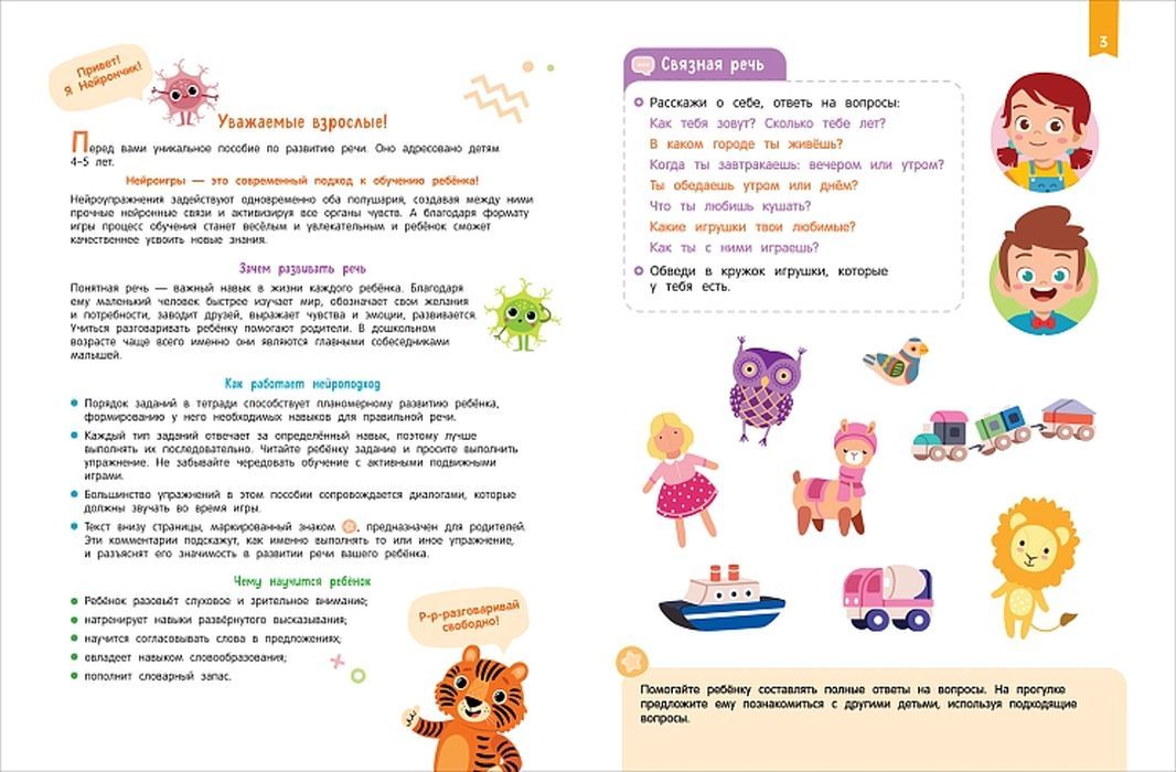 В этом пособии собраны нейроупражнения для детей 5– 6 лет. С их помощью ребёнок в легкой игровой форме познакомится новыми фразами. А современная эффективная нейрометодика поможет ему быстро перейти к построению сложных предложений. Текст внизу страницы, маркированный знаком «звездочка», читает родитель.