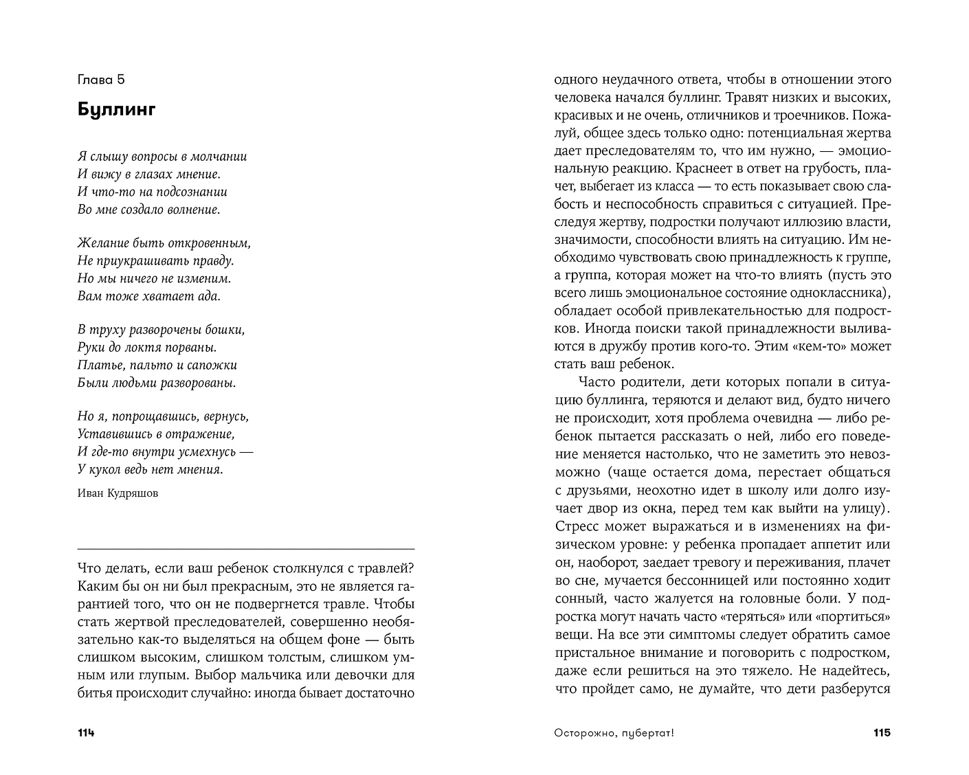 Авторы, активно консультирующие семьи с детьми, помогают подросткам и их родителям посмотреть на острые, болезненные, а иногда и очень деликатные проблемы переходного возраста с разных точек зрения: родителям — понять, о чем молчит или, наоборот, кричит их ребенок, какие чувства, ощущения, эмоции он переживает в период пубертата, а детям — осознать, что их мама и папа обычные люди, со своими проблемами и трудностями, и они рады поддержать и оказать помощь даже в самой сложной ситуации, но не всегда знают как.