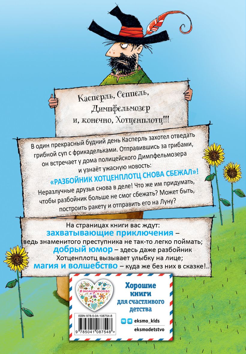 Офицер полиции Димпфельмозер в панике: Хотценплотц снова сбежал и разгуливает по округе, наводя ужас на мирных граждан. Неразлучные друзья Касперль и Сеппель вновь приходят на выручку офицеру и придумывают для поимки дерзкого разбойника нечто особенное, а именно — отправить преступника на Луну! Вы спросите: как? Конечно, построив для этого особенную ракету. Ведь с Луны Хотценплотц уже не сможет сбежать, не так ли?