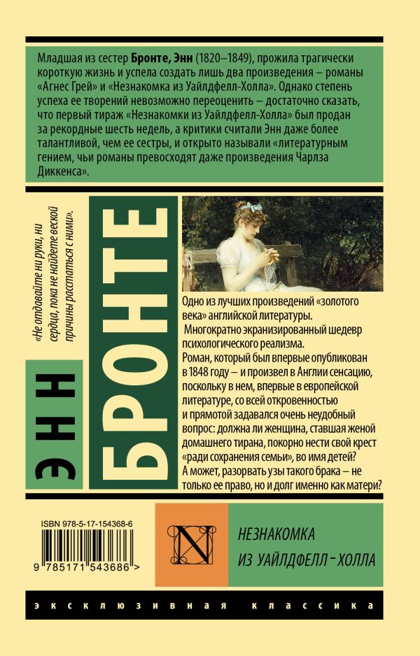 – Автор — младшая из сестер Бронте (1800–1849), прожившая трагически короткую жизнь и успевшая создать лишь два произведения. Однако творчество Энн получило восторженные отзывы и признание критиков — некоторые считали ее самой талантливой из сестер и открыто называли литературным гением.